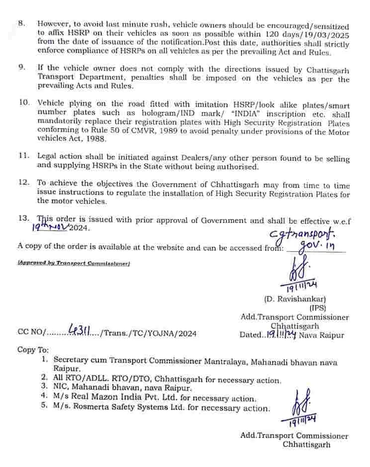 छत्तीसगढ़ में 35 लाख से ज्यादा ऐसे वाहन (HSRP Number Plate Fine) हैं, जो 2019 से पहले खरीदे गए थे, लेकिन उनमें अभी तक HSRP नहीं लग पाई है. हालांकि परिवहन विभाग ने बड़ी संख्या में वाहनों में एचएसआरपी प्लेट लगा दी है। अब नंबर प्लेट को लेकर प्रदेश में सख्ती बरती जाएगी। जहां परिवहन विभाग और यातायात पुलिस विभाग एचएसआरपी नंबर प्लेट न लगाने वालों के खिलाफ सख्त कार्रवाई करेगा।
