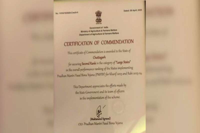 रायपुर: प्रधानमंत्री फसल बीमा योजना के शानदार और प्रभावी क्रियान्वयन के लिए छत्तीसगढ़ राज्य को राष्ट्रीय स्तर पर बड़ी सफलता मिली है। भारत सरकार के कृषि एवं किसान कल्याण मंत्रालय द्वारा आयोजित प्रधानमंत्री फसल बीमा योजना की 12वीं राष्ट्रीय समीक्षा बैठक के दौरान आज छत्तीसगढ़ को देश के बड़े राज्यों की श्रेणी में द्वितीय सर्वश्रेष्ठ प्रदर्शन करने वाले राज्य का पुरस्कार दिया गया है। राज्य के मोहला-मानपुर-चौकी और सक्ती को भी प्रधानमंत्री फसल बीमा योजना के तहत सर्वश्रेष्ठ प्रदर्शन करने वाले जिलों के रूप में चुना गया है। यह दो दिवसीय राष्ट्रीय समीक्षा सम्मेलन 18-19 अप्रैल 2025 को तिरुवनंतपुरम (केरल) में आयोजित किया जा रहा है। यह सम्मान आज भारत सरकार के कैबिनेट सचिव कृषि के हाथों छत्तीसगढ़ राज्य की ओर से संयुक्त संचालक बी.के. मिश्रा और उप संचालक उद्यानिकी नीरज शाह ने प्राप्त किया। इसके साथ ही मोहला-मानपुर-चौकी जिले की कलेक्टर श्रीमती तूलिका प्रजापति और सक्ती जिले के कलेक्टर टोपनो ने सर्वश्रेष्ठ प्रदर्शन करने वाले जिले का पुरस्कार प्राप्त किया।