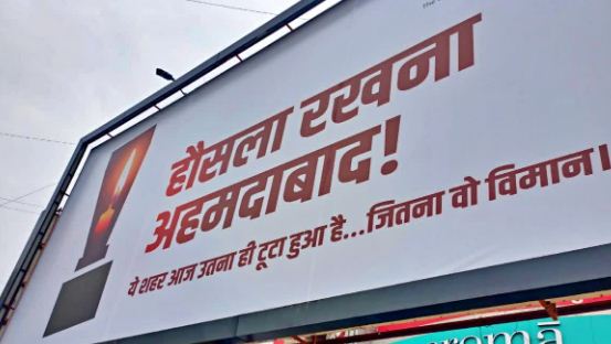 अहमदाबाद. पूरे देश को झकझोर देने वाली अहमदाबाद विमान दुर्घटना का दर्द देश में हर जुबां बयां कर रही है. अहमदाबाद पर तो दुखों का ऐसा पहाड़ टूटा है कि जिसे देखो उसकी आंखें नम हो रही हैं. शहर को हौंसला देने और इस दुख से उबारने की कवायद भी शुरू हो गई है. बाकायदा शहर के मुख्य चौराहों पर बैनर-पोस्टर इस जख्म पर मरहम की तरह नजर आ रहे हैं. बैनर का शीषर्क कुछ हद तक ही सही अहमदाबाद के लोगों को ढ़ाढस बंधाने का काम कर रहा है. बैनर और पोस्टर पर लिखा है, '' हौंसला रखना अहमदाबाद, ये शहर उतना ही टूटा है जितना वो विमान.'' देखें ईटीवी भारत की ये ग्राउंड रिपोर्ट.