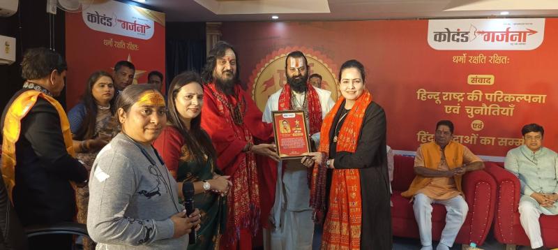ज्योतिषाचार्य पं. अरविंद तिवारी ने कहा कि भारत का पुनरजागरण हो चुका है। 2029 में संविधान में बड़ा बदलाव होगा, उसके बाद एकरूपता आयेगी। वर्ष 2050 के बाद भारत विश्व गुरु बनेगा। अभिभाषक डॉ. पंकज वाधवानी ने कहा कि सनातन धर्म सह अस्तितव् और स्वबंधुत्व की बात करता है। जैन, यहूदी और सिख धर्म से भी कई गुणा पुराना है हिंदू धर्म। यदि भारत को हिंदू राष्ट बनाना है तो हमें संविधान को बदलना होगा। पूर्व विधायक जीतू जिराती ने कहा कि वर्ष 2014 के बाद भारत में अभुतपूर्व बदलाव आया है। साधु -संतो का मान - सम्मान बढ़ा।धार्मिक स्थलों पर भक्तो की संख्या कई गुणा बढ़ गई है। अखिल भारतीय बलाई समाज के राष्ट्रीय अध्यक्ष मनोज परमार ने कहा कि गिरी, कंदराओ और जंगलो में रहने वाला आदिवासी समाज हमारे बंधु है उन्हे साथ रखना जरूरी है, अन्यथा उनका धर्मांतरण हो जायेगा। इसको रोकना जरूरी है। ज्योतिषाचार्य पं. अजय व्यास ने कहा कि भारत को वर्षो बाद नरेंद्र मोदी के रूप में एक योग्य लीडर मिला है, जो अपने कार्यो से पूरी दुनिया में भारत की धर्म ध्वजा को लहरा रहा है। अगले चुनाव में भी मोदी के प्रधान मंत्री बनने के पूरे आसार है। सनातन धर्म पर हर भारतीय को गर्व करना चाहिए। अभिभाषक दुर्गेश तिवारी ने कहा कि भारत घोषित रूप से हिंदू राष्ट है। कुछ राजनीतिक दलों में इच्छा शक्ति नहीं होने की वजह से भारत हिंदू राष्ट् नहीं बन रहा है। कार्यक्रम का संचालन आलोक बाजपेयी, ऋतु साहू एवं डॉ. प्रदीप राव ने किया। कार्यक्रम का शुभारंभ अतिथियों ने दीप प्रजवलित कर किया। इसके पूर्व बच्चों ने हनुमान चालीसा की संगीतमय प्रस्तुति दी। कार्यक्रम में विनीत शर्मा बिजनेस हेड ओमेक्स ग्रुप, डॉ. आयुषी देशमुख अध्यक्ष सूर्योदय आश्रम, डॉ. अलका झा चित्रकार मधुबनी, दर्शन देवड़ा सामाजिक कार्यकर्ता, रितेश माहेश्वरी सामाजिक कार्यकर्ता, सोनू गहलोत सामाजिक कार्यकर्ता का सम्मान किया गया। धर्म संसद में राजेश दिसावल, हर्षवर्धन सिंह, प्रवीण जोशी, रवि यादव, अंबर नायक, नवीन यादव, कृष्णकांत रोकड़े सहित संत - महंत, विद्वतजन, धर्मानुरागी आदि बड़ी संख्या में उपस्थित थे। सभी अतिथियों का स्वागत कोदंड गर्जना की संपादक और सयोजक शीतल रॉय ने किया। इस मौके पर अतिथियों ने कोदंड गर्जना की पांचवीं वर्षगांठ में प्रकाशित विशेषांक का विमोचन करते हुए कहा कि आज ऐसे ही पत्र की जरूरत है, जो समाज में समरसता लाये।