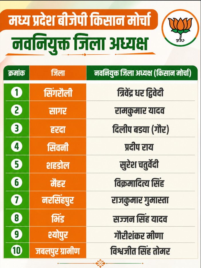 इससे पहले शुक्रवार को पार्टी ने 16 प्रमुख जिलों के लिए किसान मोर्चा की कमान सौंपी थी। इनमें प्रमुख नियुक्तियां इस प्रकार रहीं: